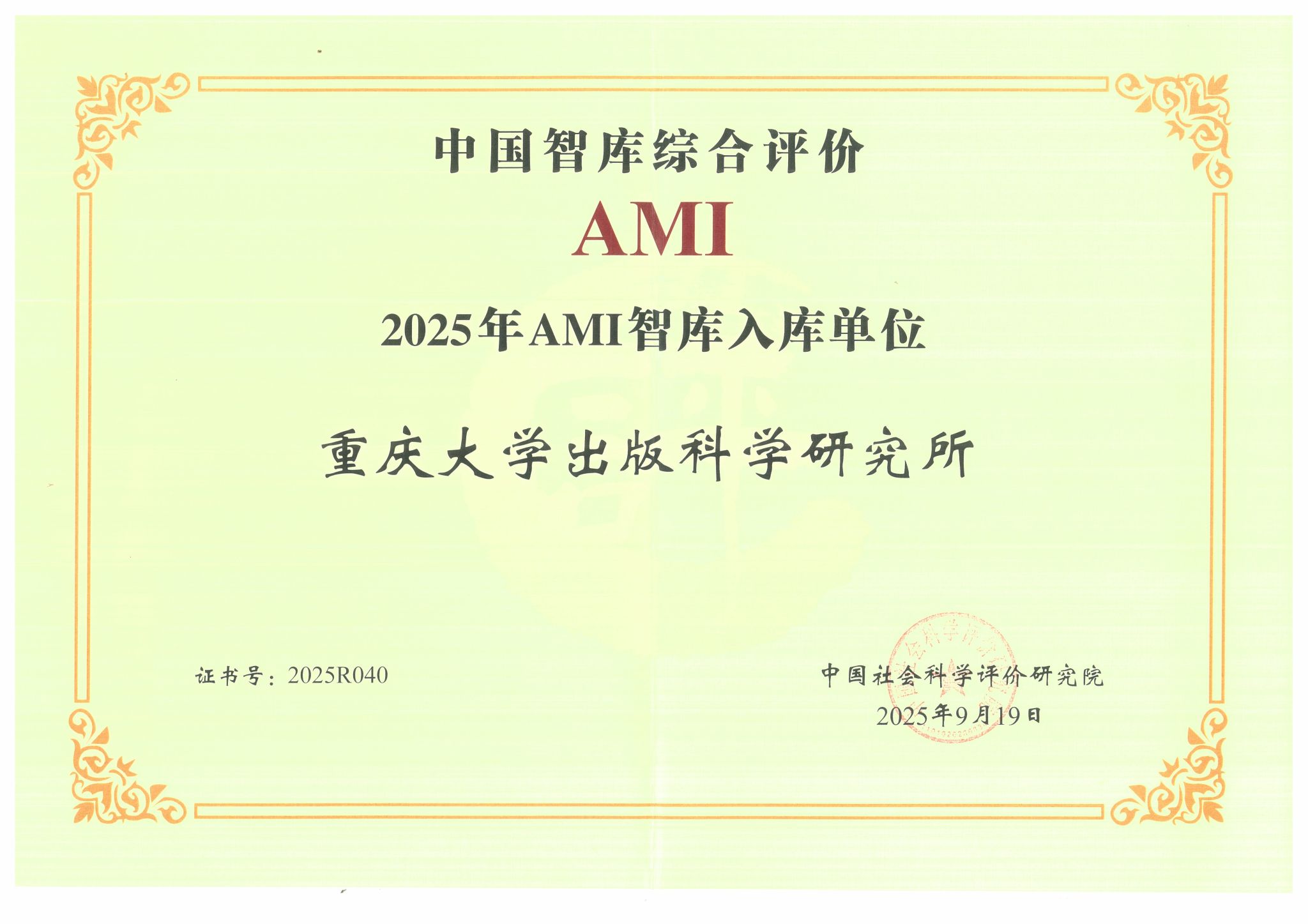 近日,中国社会科学评价研究院给国家级出版智库——重庆大学出版科学研究所颁发了“2025年AMI智库入库”证书,重庆大学出版科学研究所正式入选“中国智库综合评价研究项目2025年AMI智库入库名单”。