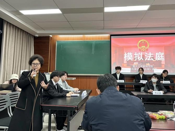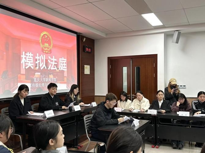 2025年11月20日晚,重庆大学新闻学院《传媒伦理与法规》本科生课程的课堂热闹非凡。杨秀教授邀请重庆市南岸区人民法院周俐莎法官走进课堂,对三组学生的“情景剧视频展播+模拟法庭实操”成果进行专业点评。同学们按抽签顺序依次登台展示,全程穿插法官与授课教师的精准点评,最终评选出一、二、三等奖并现场颁奖,为本次“传媒+法治”实践教学新形式画上圆满句号。