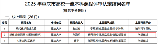 近日,重庆市教育委员会公布了2025年重庆市高校一流本科课程评审认定结果。我院申报的《媒体道德原理(新闻伦理学)》、《舆论学》和《中外名记者研究》三门课程成功入选,分别获评“线上课程”、 “线下课程”和“线上线下混合式”类别一流本科课程,体现了我院在课程建设与教学改革方面的显著成效。